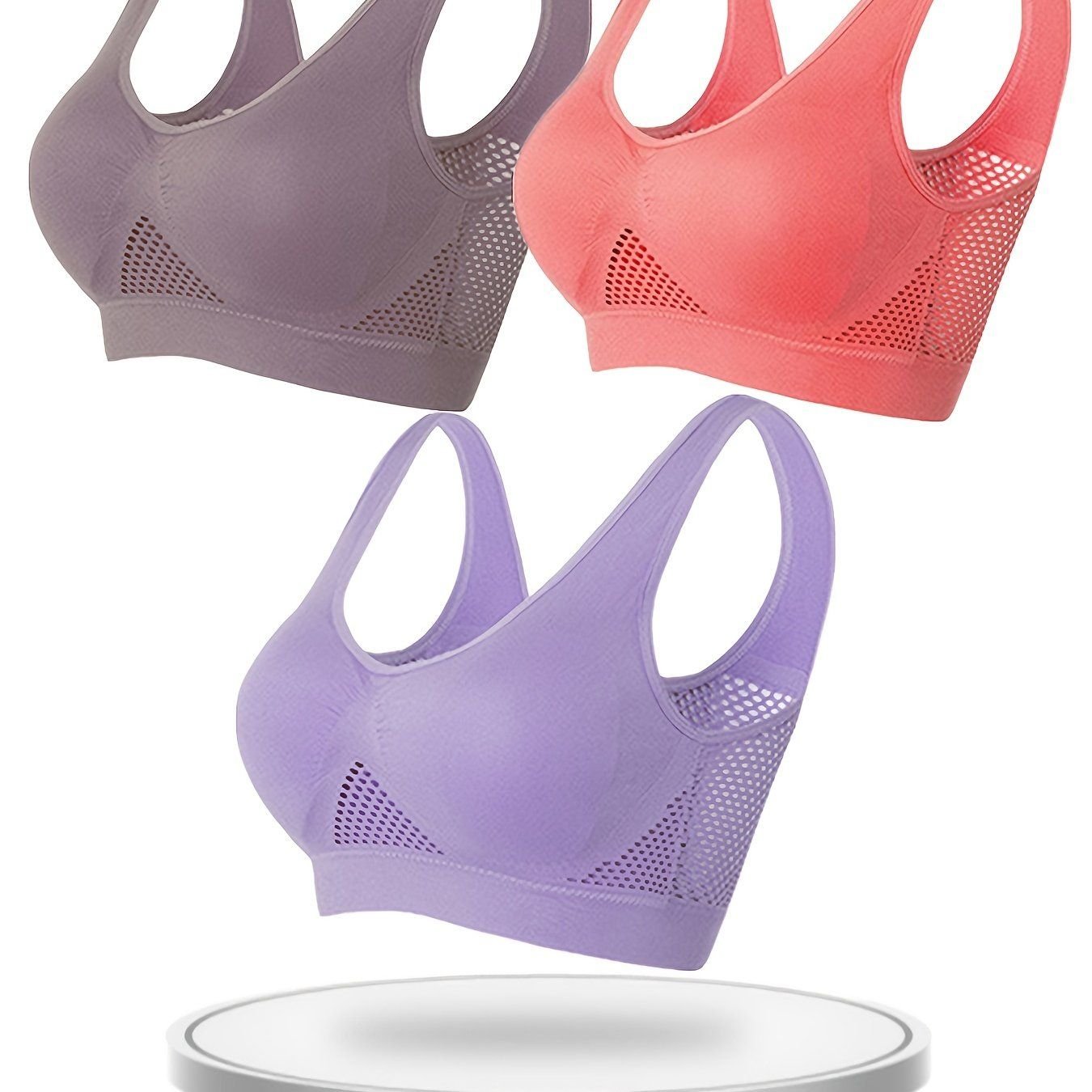 3 Pcs Breathable Solid Eyelet Mesh Hole Vest Sports Bras, Plus Size Non-steel Running Yoga Bras, Women's Lingerie & Underwear